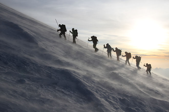 Nach einigen Akklimatisierungstouren im Baksantal (Tscheget Karabashi, 3.400 m, Gumachi Pass, 3.800 m) und am Elbrus selbst (Pastuchovfelsen, 4.800 m) steht die Gipfelbesteigung am Programm.